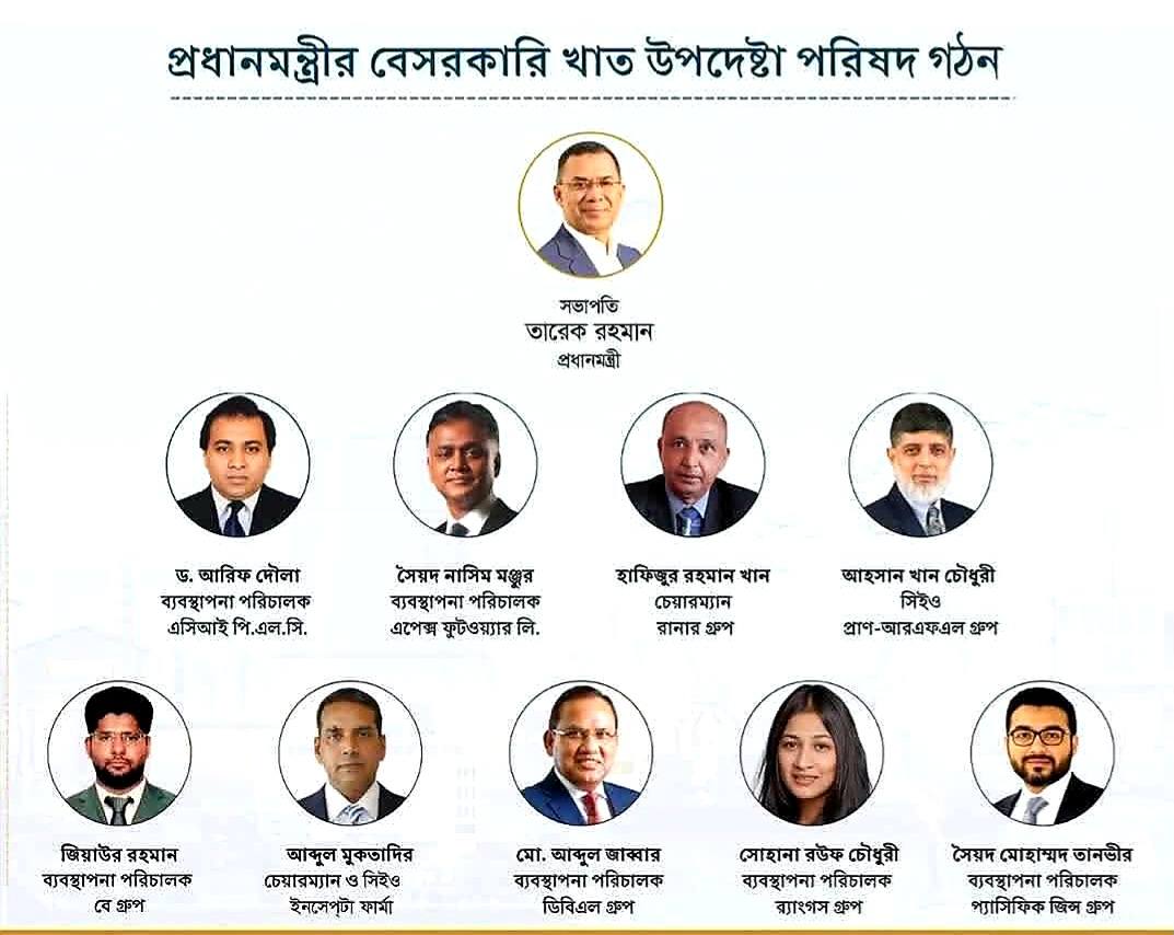 প্রধানমন্ত্রী তারেক রহমান দেশে প্রথমবারের মতো বেসরকারি খাত উপদেষ্টা পরিষদ গঠন করেছেন। এর মাধ্যমে দেশের ব্যবসায়ী প্রতিনিধিরা ব্যবসা ও বিনিয়োগের পরিবেশ এবং সংস্কারের ক্ষেত্রে অগ্রাধিকার বিষয়ে সরকারের সর্বোচ্চ পর্যায়ে সময়োপযোগী ও কাঠামোবদ্ধ মতামত দিতে পারবেন। ৪ এপ্রিল প্রধানমন্ত্রী তারেক রহমানের সভাপতিত্বে তার কার্যালয়ে পরিষদের প্রথম সভা হয়।